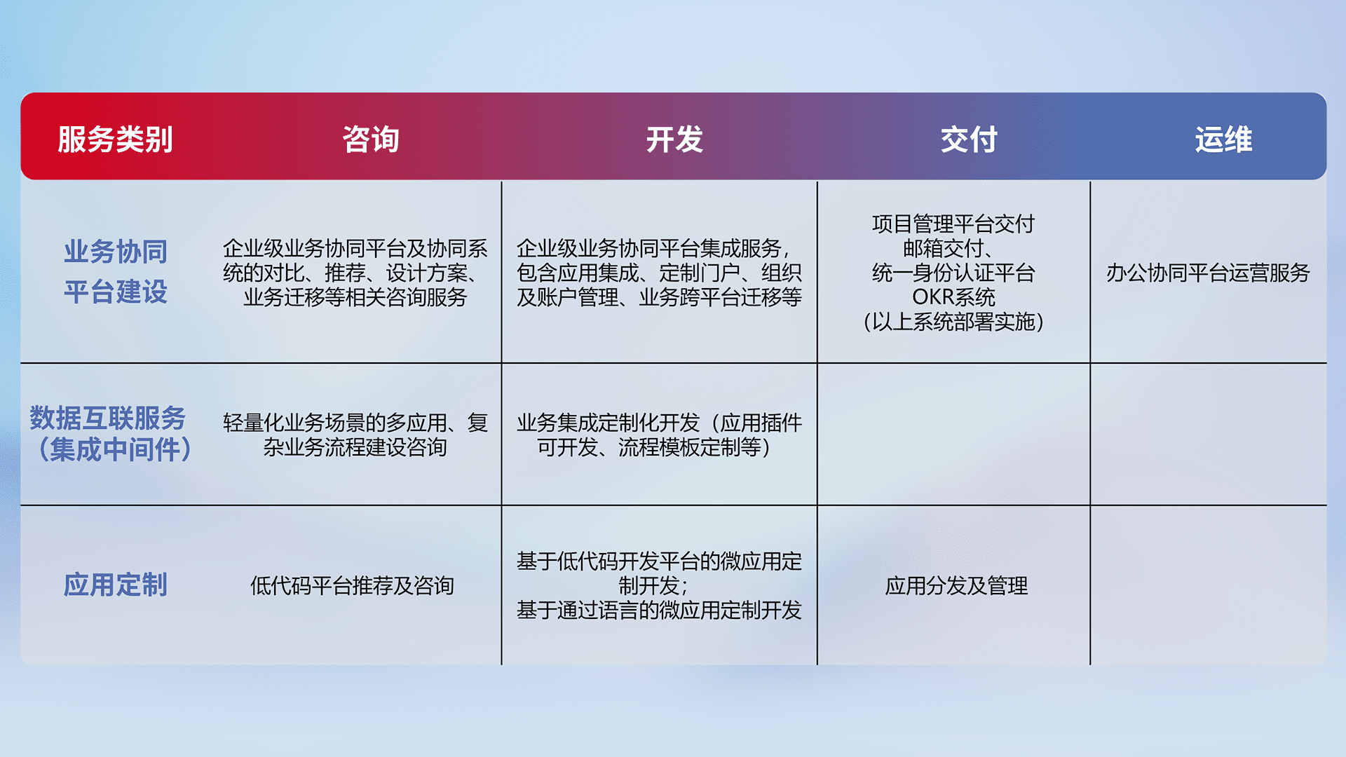 针对钉钉、、、企微、、、、IDaas等平台级产品提供产品的规划、、方案、、交付、、定制化开发等服务,,,实现如统一协同办公、、、、智能客户服务、、、、混合会议管理、、智能数据查询、、等业务场景,,,实现数字化转型。。。。